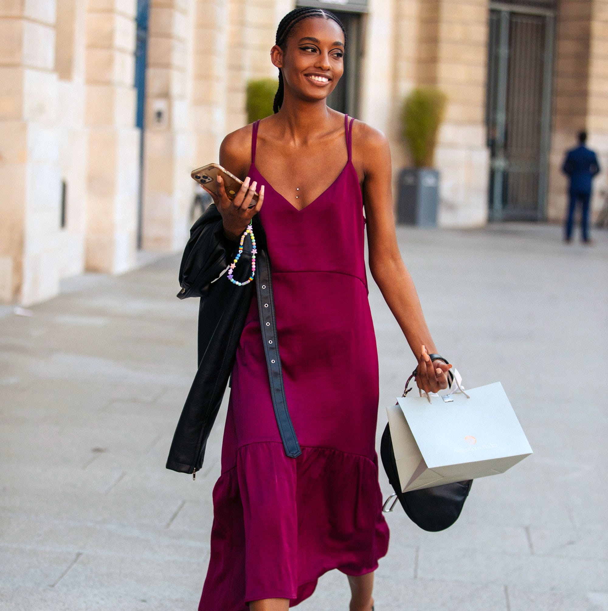 Layer your slip dress over a plain white tee or under a leather jacket. Add strappy sandals or chunky boots depending on the vibe.