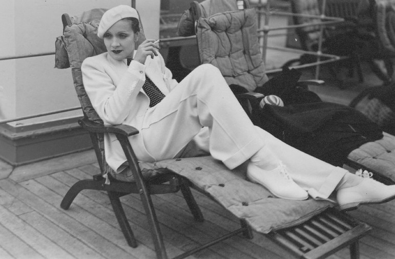 Chanel, like style icons Marlene Dietrich and Katharine Hepburn, was a trailblazer in championing trousers for women in the twenties and thirties. At a time when they were considered quite scandalous for women to wear, Chanel chose to team her wide-legged trousers with sailor tops, or to wear gleaming white satin pyjamas in her salon or on the beach.